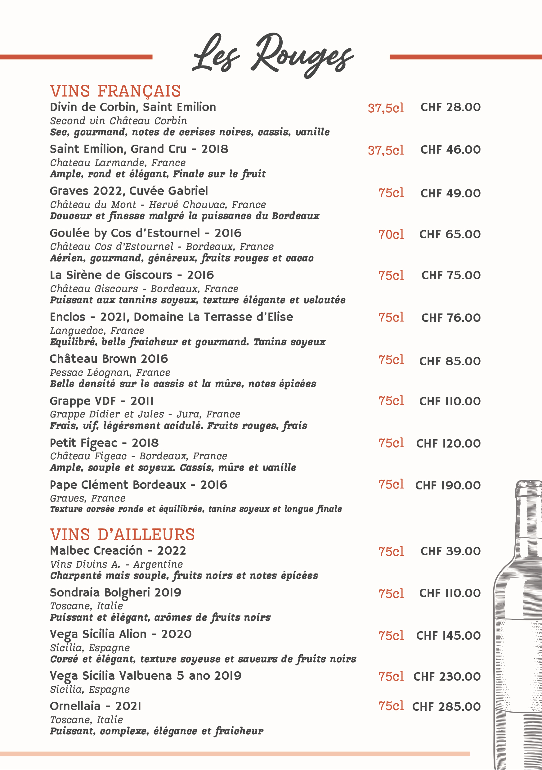 Les Vins rouges étrangers Les Vins rouges suisses les vins au verre Les vins blancs les bulles et rosés Les Vins rouges suisses les vins au verre Les vins blancs les bulles et rosés